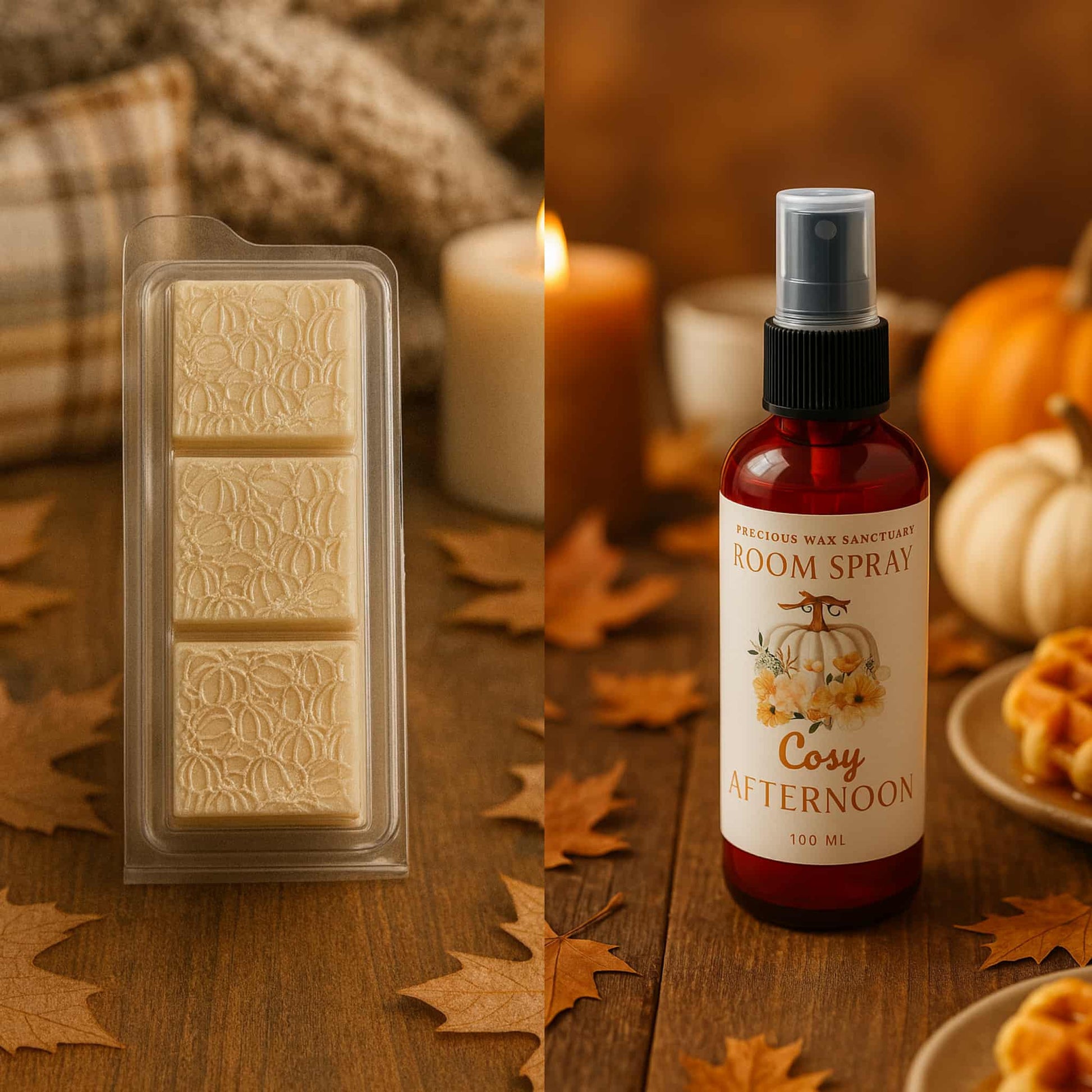 Cosy Afternoon - Indulge in the inviting aroma of freshly baked warm pumpkin and pecan waffles, evoking cosy afternoons. Immerse yourself in the rich blend of crispy caramelised sweetness, reminding you of golden leaves underfoot and the warmth of the sun.