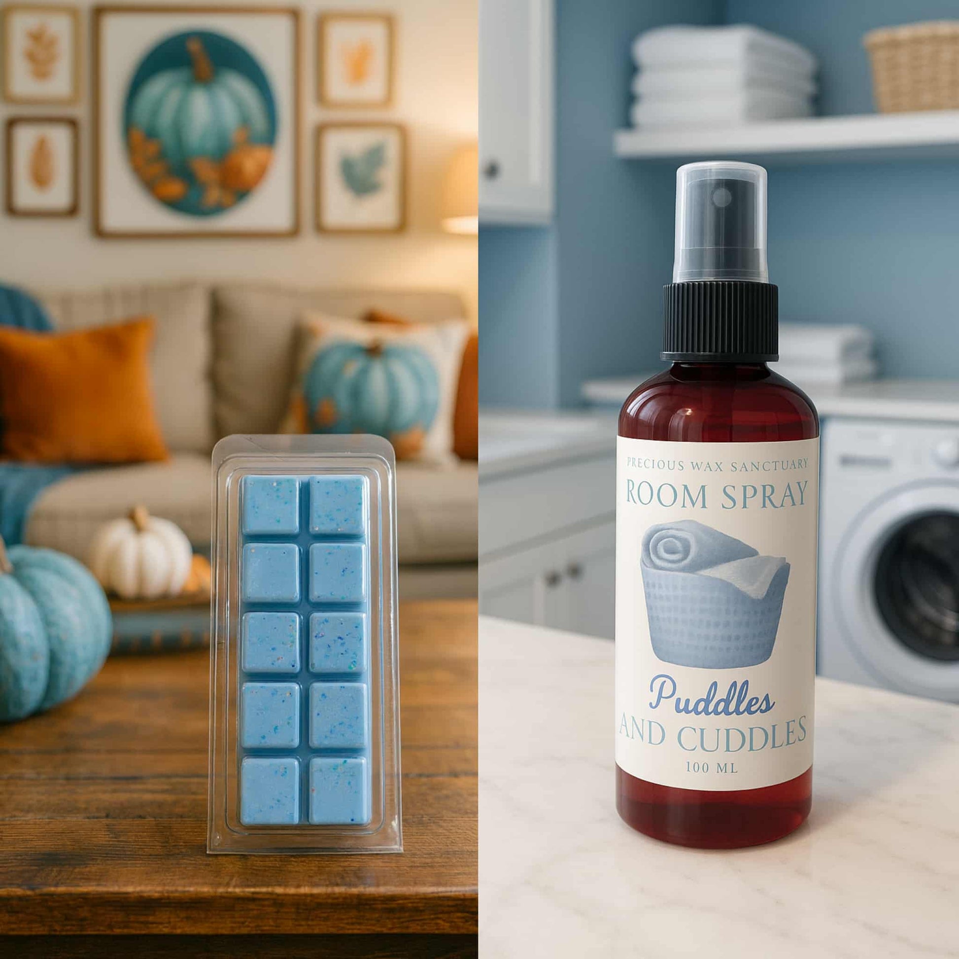 Puddles and Cuddles - This delightful fragrance blends powdery, musky florals with radiant violet and orange blossom, complemented by refreshing jasmine and lily. A soothing base of gentle woods and aquatic green notes rounds out the experience, bringing the uplifting spirit of sunny days and playful puddle splashes into your home.